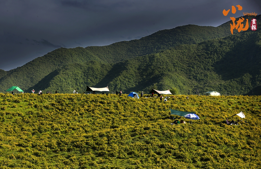綽約多姿的金露梅,等不來蜜蜂蝴蝶的親吻,卻迎來如織游人,人氣爆棚,他們在花叢中嬉戲,爭先用相機記錄這別樣的風景。
