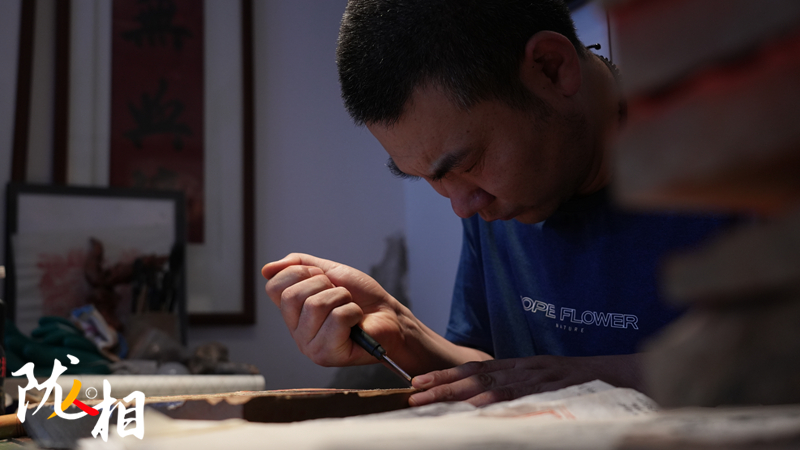 立秋前夕,在“脈望閣”書房里,安靜地只聽見屏氣凝神的呼吸聲,專業的刻刀、常用的手工宣紙、幾塊梨木板,靜寧縣傳統雕版印刷非遺傳承人李安樂正一絲不茍地在有繪畫的梨木上進行雕刻作品。