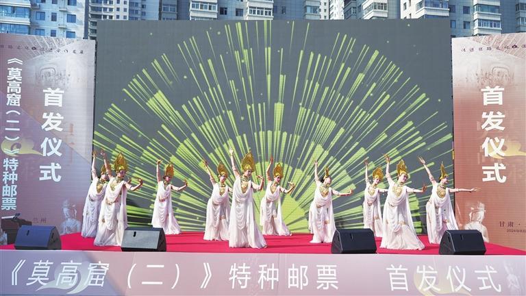 敦煌文化博大精深,敦煌舞蹈美輪美奐。首發儀式上,舞者身著飄逸的古裝,頭戴華麗的發飾,手持飄帶,仿佛從天而降的仙子。她們在音樂的伴奏下,翩翩起舞,輕盈如燕,婉約如風,一曲《千手觀音》拉開了《莫高窟(二)》特種郵票發行儀式的序幕。
