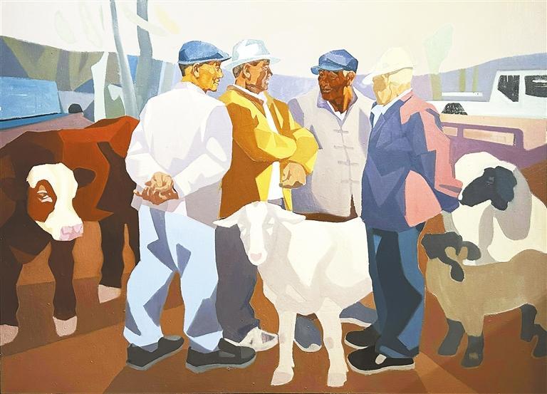 《和風》系列作品取材于禮縣鹽官鎮騾馬市場逢集時交易的場景。幼時,我經常隨父親去鹽官騾馬市場趕集,對這個場景熟悉且親切。也正因為如此,我對這個題材有著難以割舍的情愫,總是忍不住想通過畫筆呈現這一記憶。
