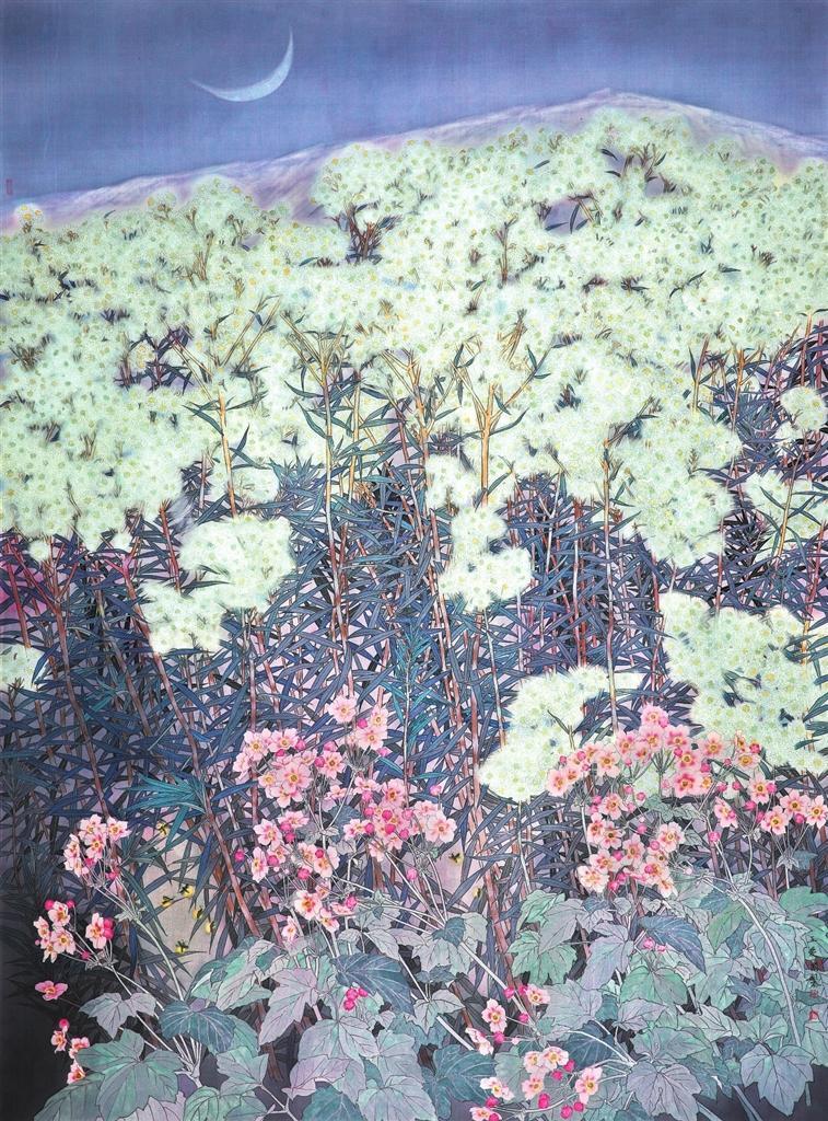 《白露》主要以白色野花香青為主體,野棉花為輔。拉長香青的枝干,以增強畫面的氣勢,繁茂的白花溫馨、浪漫,婀娜的野棉花花朵打破畫面的單調,葉子又構成小團塊整體。夜幕下一輪新月,應和著紫灰色的畫面主色調,增強了這種美好氛圍。