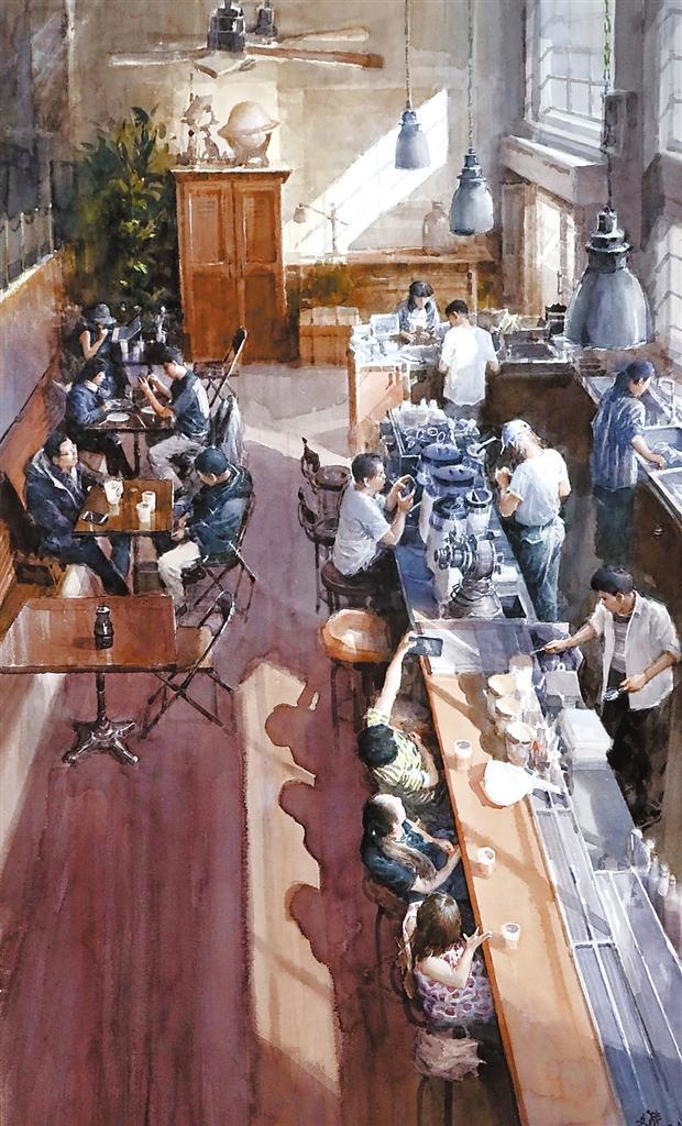 《網紅咖啡館的午后》用寫實方法展現了一個溫馨的生活場景。在構圖上,以俯視的角度用大場景來做整體畫面的籌劃,在整體色調上以沉穩厚重的暖色作為基調,把光線穿插、引入到畫面中。在布局上,以陽光照耀下的咖啡館吧臺為主要表現組群,分別刻畫、塑造了工作中的前臺人員、打卡拍照的女性顧客群;把暗部區域,幾組在咖啡桌邊交談、用餐、喝咖啡的顧客群作為第二層次,展現他們不同的神情和體態;然后完善整體的空間感。在用筆上盡量以松動的筆觸,又能展現細節的方式來塑造,利用水彩畫需要干、濕、松、緊相結合,多層次、多遍數進行渲染的特性,盡可能達到預期效果。 (本版文圖由甘肅省美術家協會提供)