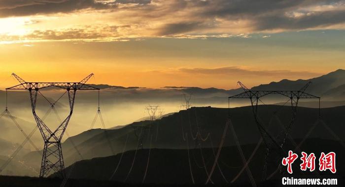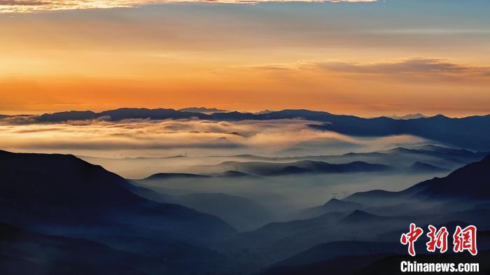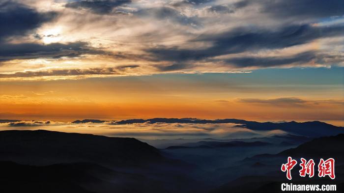 8月14日晚,蘭州市榆中縣馬坡鄉(xiāng),夕陽在云海里翻滾,映照大地和村莊城鎮(zhèn),美不勝收。圖為云海日落籠罩黛青色山脈。丁永睿 攝