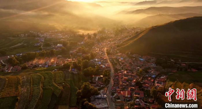 8月14日晚,蘭州市榆中縣馬坡鄉(xiāng),夕陽在云海里翻滾,映照大地和村莊城鎮(zhèn),美不勝收。圖為日落映照城鎮(zhèn)。牛遠(yuǎn)明 攝