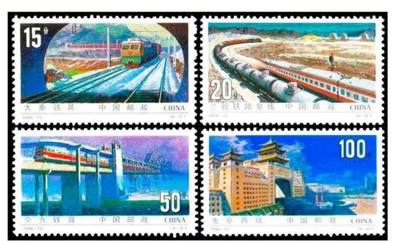 1996年9月,我國發行編號為1996-22的《鐵路建設》郵票一套四枚,其中T4-2圖為蘭新鐵路復線。票面上,一貨一客兩列火車蜿蜒在蘭新鐵路復線,氣勢如虹。而嘉峪關關城作為一個地理標志,被處理成蘭新鐵路復線的背景圖案,放在郵票主圖的后方。盡管由于票面所限,背景圖案上的嘉峪關關城畫面很小,無以淋漓盡致地表現嘉峪關城樓的細節,但其“天下第一雄關”的雄姿絲毫不減。而嘉峪關出現在表現甘肅特色乃至蘭新交通主線的票面上,也足見其地理位置的重要性。