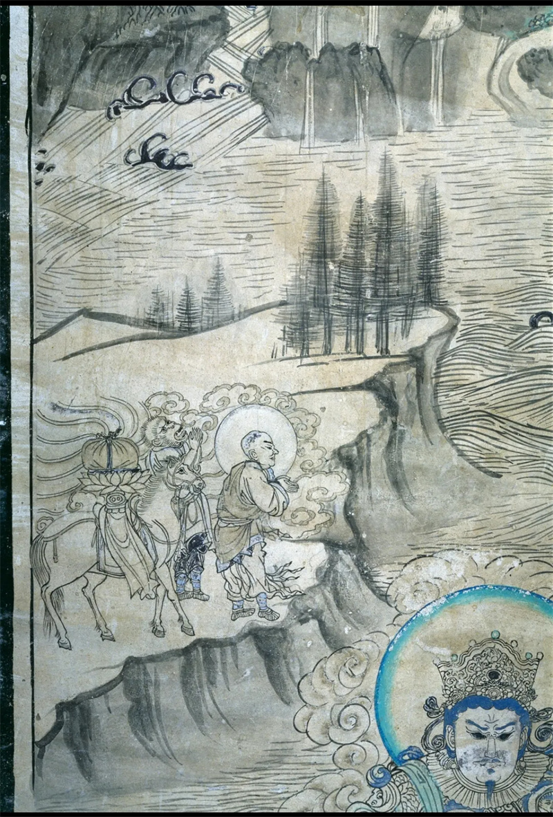 敦煌壁畫中現存六幅唐僧取經圖,其中時代最早、保存最完好的一幅繪于西夏時期榆林窟第3窟的《普賢變》中。此幅唐僧取經圖似是唐僧師徒在取經途中遭遇難關,誠心祈求菩薩協助渡難。圖中,唐僧身披袈裟,雙手合十,彎腰向前,遙望普賢菩薩參拜。唐僧身后,長相似猴的人雙手合十,抬頭仰望,向普賢致禮,他就是孫悟空的原型——石磐陀。師徒身后有一匹白馬,靜立等待。他們站在懸崖深壑前,面前呈現山窮水盡已無路的困境。