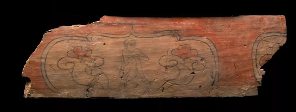 彩繪“猴”生肖木版畫,唐代,一級文物。1979年肅南縣大長嶺唐墓出土。木版畫長73厘米,寬22厘米,猴生肖木版畫呈長方形,墨筆雙線勾勒一壸門開光。壸門內墨線勾勒一猴,其雙手環抱膝蓋至胸前,猴身兩側繪有兩朵升騰祥云。壸門外飾以土紅色。