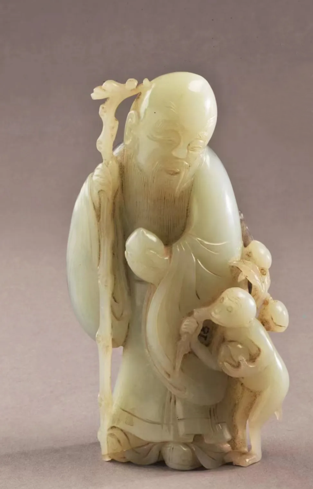 玉壽星,清代,高15.5厘米,寬9厘米,厚4.7厘米。用整塊和田青白籽料琢制,正面玉質潔白溫潤,背部有黑灰泌色。壽星頭微左傾,桃額,慈目善眉,大耳長頸,著廣袖大袍,左手持壽桃,右手持龍首杖,袍下微露云頭履。左側有一躬身站立猴子,左臂抱一壽桃,右肩扛桃枝。玉雕為俏色雕刻而成,融圓雕、線刻、透雕等手法,將壽星的慈祥和小猴子的可愛表現于一體。