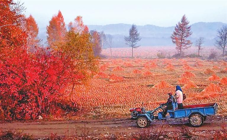 各個街口涌出的大車,宛若一條條歡快的溪流,或匯入主流奔向大道,或錯肩而過進入岔道。各家各戶的車把式,吆著喝著,比著拼著,迎著晨曦,向著自家豐收了的莊稼地奔去。