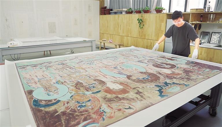 裱畫是技術活,但裝裱整壁的臨本對體力也有一定要求。徐喆和同伴多次裝裱四五米的作品,經常會忙到深夜。“裝裱工作是壁畫臨摹完成后的一道工序,裝裱的好壞不但影響作品呈現的效果,也影響作品未來的長久保存。”