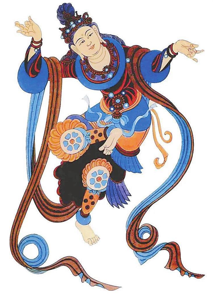 敦煌莫高窟,窟窟有壁畫,拼接起來長達45000多平方米,有世界上“最大畫廊”之稱。這些壁畫中,幾乎每幅都有舞蹈形象,如在窟頂、龕楣、藻井遨游的飛天,憑欄上的天宮伎樂,經(jīng)變畫中的娛佛、敬佛的獻舞者——伎樂天,出行圖中跳著具有濃郁生活氣息的世俗樂舞,以及富有舞蹈美感的彩塑菩薩、天王力士等,琳瑯滿目,精妙絕倫。這些舞蹈形象充分反映了從十六國北朝至元代千余年來不同歷史時期的舞蹈服飾、形態(tài)、風貌,為我們挖掘、整理、弘揚中華民族舞蹈文化提供了十分珍貴的形象資料。