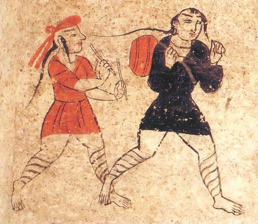 除此之外,河西彩繪壁畫磚圖像中,還有一些反映娛樂(lè)的圖像,主要有樂(lè)舞圖和六博圖。高臺(tái)地埂坡壁畫中的“角抵百戲”中,一著辮者在作表演,他小腿部網(wǎng)狀綁腿,蹲踞,雙手?jǐn)傞_,似乎是在表演魔術(shù),又似乎是在歡迎到場(chǎng)的人們。“擊鼓”中,兩人網(wǎng)狀繃腿,髡發(fā)梳辮,著黑裝者背鼓,著紅裝者持雙鼓槌準(zhǔn)備擊鼓。孫機(jī)先生謂,戰(zhàn)國(guó)迄漢盛行六博,博具和博戲的圖像在考古資料中不乏其例。甘肅以武威磨嘴子漢墓出土木六博俑為例。六博俑以簡(jiǎn)單明確的藝術(shù)造型,刻畫了兩個(gè)老者全神貫注博弈的場(chǎng)面,惟妙惟肖地表現(xiàn)出對(duì)弈時(shí)蓄勢(shì)待發(fā)的場(chǎng)面。在高臺(tái)壁畫墓中的博戲場(chǎng)面略有不同,二博者戴船形帽,打手勢(shì)。從相貌看,很可能是少數(shù)民族。高臺(tái)出土彩繪壁畫磚上,兩人動(dòng)作幅度更大,左邊一人的黃紅色著裝和博具上的零散物品,顯得場(chǎng)面更為熱烈激情。