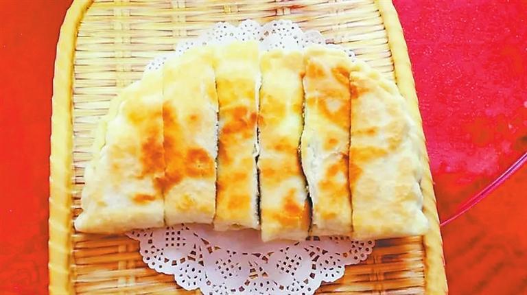 烙饃的面須是醒好的白面,而且要多揉一會兒,越揉越勁道,烙出來的饃,也越有嚼勁。只見母親先將揉好的面棒,切成一段一段的面節子,而后搟成小面碗樣大的圓餅,對折后把麻腐餡兒均勻地抹在下半扇上,另半扇蓋上去,壓邊,捏花,一個麻腐盒子饃便做成了。