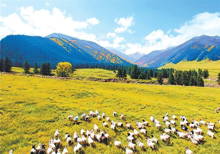 走進景區,映入眼簾的便是布爾智峽谷,其重巒疊嶂,造型奇特。進入峽谷,豁然中開,地勢平坦,視野開闊,形成五山匯集的盆地景觀,一條悠悠的小河穿過盆地的胸膛,明亮清澈。遠山白雪皚皚,山腰云杉參天,山下灌木叢生,蒼翠蔥郁,山底蒼蒼茫茫的草原上,不時涌動著潔白的羊群。徜徉于廣袤的草原,便真正體味到“鳥的世界,花的海洋”的博大內涵。