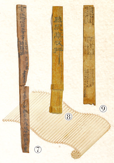 圖⑦⑧⑨:懸泉置遺址出土漢簡。其中,圖⑦為郵書刺刻齒簡。甘肅簡牘博物館供圖 |