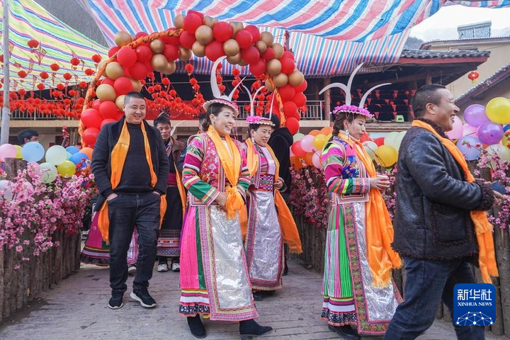 2022年1月13日,在隴南市文縣鐵樓藏族鄉寨科橋村,婚禮宴席結束后賓客到村寨中走親訪友。新華社記者 郎兵兵 攝