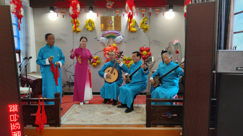秦安縣集賢村文化活動室內,集賢文藝劇社的社員們正在排練演唱新編秦安小曲。新華網發(郭林玉 攝)