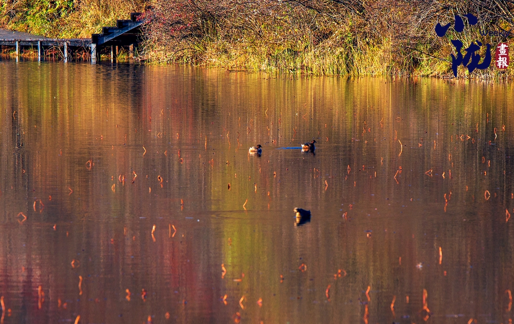 湫水深不可測,湫池依偎在深林密樹旁邊,湫面蕩起縷縷波紋,浮光泛金,一群悠閑的野鴨在水面上游來游去。