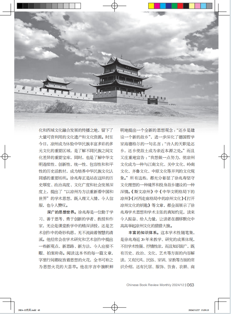 著名文化學者、作家徐兆壽教授又推出了一本力作《斯文涼州》,這本書盡管是徐兆壽寫給故鄉(xiāng)涼州的書,但完全不同于以往作家一味地眷戀和贊美故鄉(xiāng)的著作,而是一本具有深厚學術思想、深刻學術洞見、深廣學術視野、深層學術理念的文集,所以我把這本書稱之為學術性隨筆集。