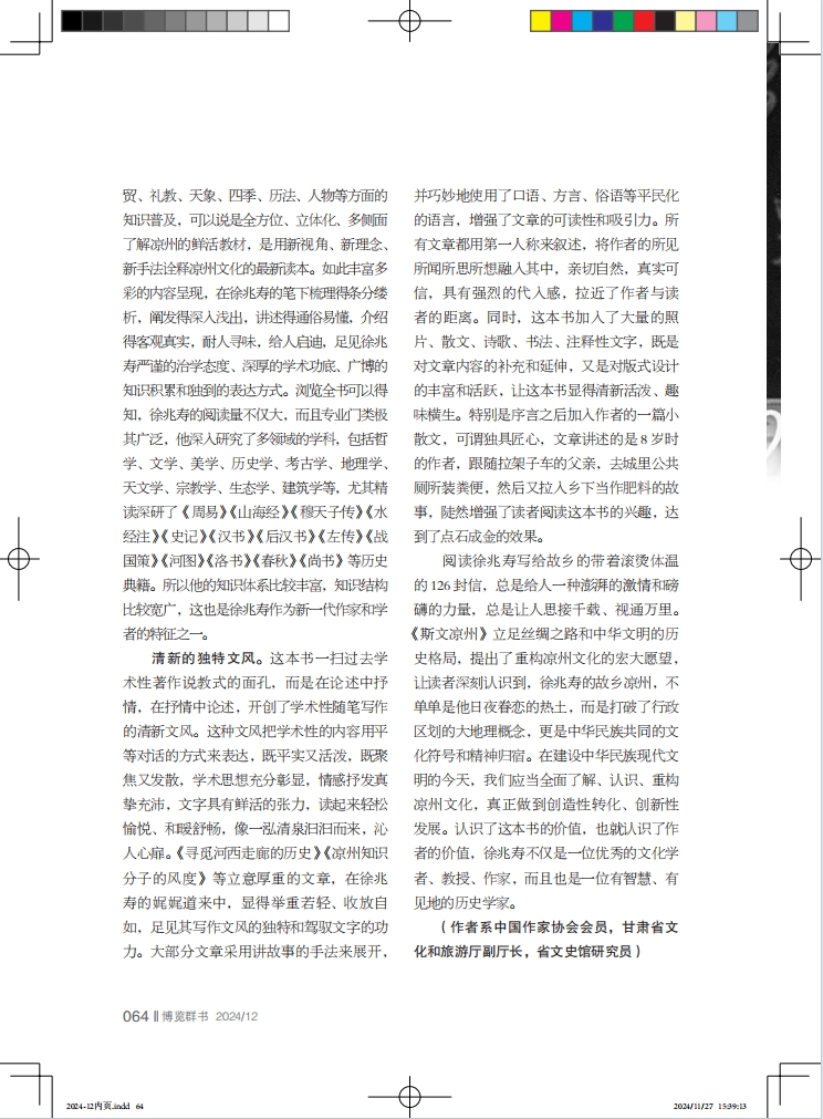 豐富的知識體系。這本學術性隨筆集,是徐兆壽近20年來教學、研究的成果體現(xiàn),不但學術性強、抒情性濃,而且知識面廣,既有歷史、政治、文化、藝術等方面的內容解讀,又有民風、民俗、家訓、家教等方面的常識介紹,還有民居、服飾、飲食、農耕、商貿、禮教、天象、四季、歷法、人物等方面的知識普及,可以說是全方位、立體化、多側面了解涼州的鮮活教材,是用新視角、新理念、新手法詮釋涼州文化的最新讀本。如此豐富多彩的內容呈現(xiàn),在徐兆壽的筆下梳理得條分縷析,闡發(fā)得深入淺出,講述得通俗易懂,介紹得客觀真實,耐人尋味,給人啟迪,足見徐兆壽嚴謹的治學態(tài)度、深厚的學術功底、廣博的知識積累和獨到的表達方式。瀏覽全書可以得知,徐兆壽的閱讀量不僅大,而且專業(yè)門類極其廣泛,他深入研究了多領域的學科,包括哲學、文學、美學、歷史學、考古學、地理學、天文學、宗教學、生態(tài)學、建筑學等,尤其精讀深研了《周易》《山海經》《穆天子傳》《水經注》《史記》《漢書》《后漢書》《左傳》《戰(zhàn)國策》《河圖》《洛書》《春秋》《尚書》等歷史典籍。所以他的知識體系比較豐富,知識結構比較寬廣,這也是徐兆壽作為新一代作家和學者的特征之一。