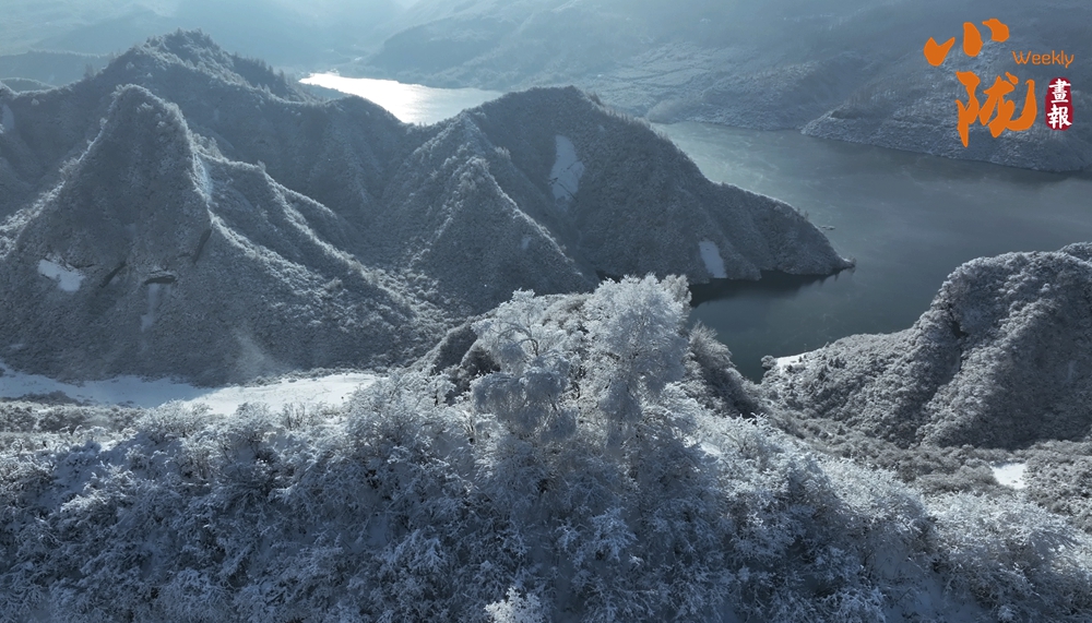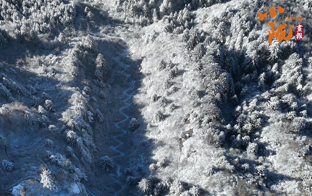 云霧繚繞中,太子山主峰巍峨壯觀,翠色與白雪交織,綿延起伏的山巒溝壑被銀裝緊緊包裹,閃爍著迷人的光芒。