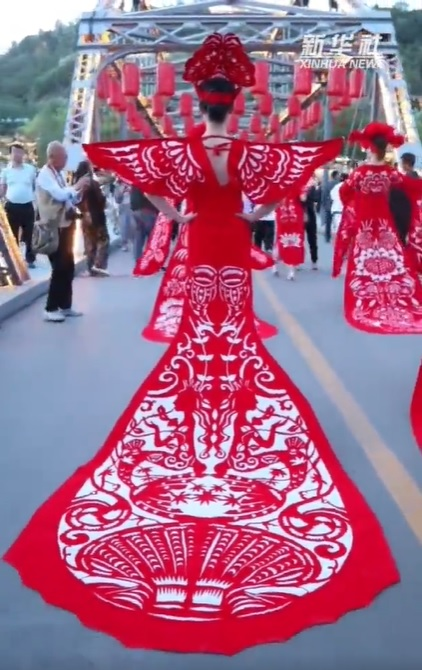 慶陽剪紙?jiān)从谏睢⒅v究情趣,是勞動(dòng)人民生產(chǎn)生活、情感氣質(zhì)、觀念習(xí)俗和文化傳承的結(jié)晶。著名民俗學(xué)家靳之林先生稱剪紙藝人是“真正的藝術(shù)家”。1986年,中央美術(shù)學(xué)院邀請(qǐng)鎮(zhèn)原縣民間美術(shù)大師祁秀梅赴北京進(jìn)行民間美術(shù)教學(xué)交流,向大學(xué)生演示民間剪紙。法國、日本、澳大利亞等國家的藝術(shù)家也多次專程到隴東考察民間剪紙藝術(shù)。慶陽剪紙已由鄉(xiāng)村婦女手中的小玩意,堂而皇之地步入了國家藝術(shù)殿堂——中國民間美術(shù)館,并在日、意、澳等國家展覽亮相。圖為身著慶陽剪紙服裝的模特們行走在蘭州中山橋上,驚艷了來往的游客。