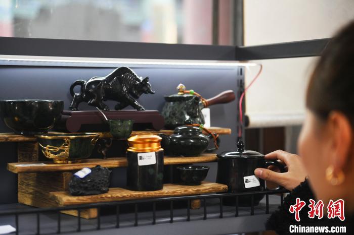 2月8日,甘肅省蘭州市城關區“非遺年貨購物月”活動現場,游人挑選武山鴛鴦玉夜光杯茶具。中新社記者 李亞龍 攝