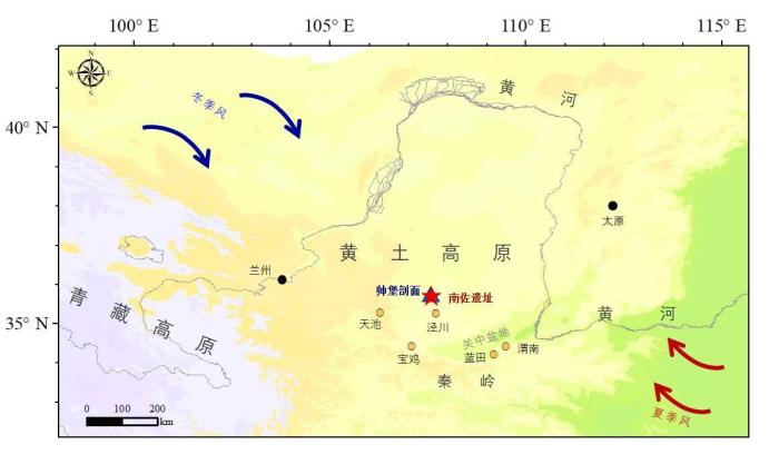 南佐遺址和帥堡剖面地理位置及所受季風影響示意圖。韓建業 供圖