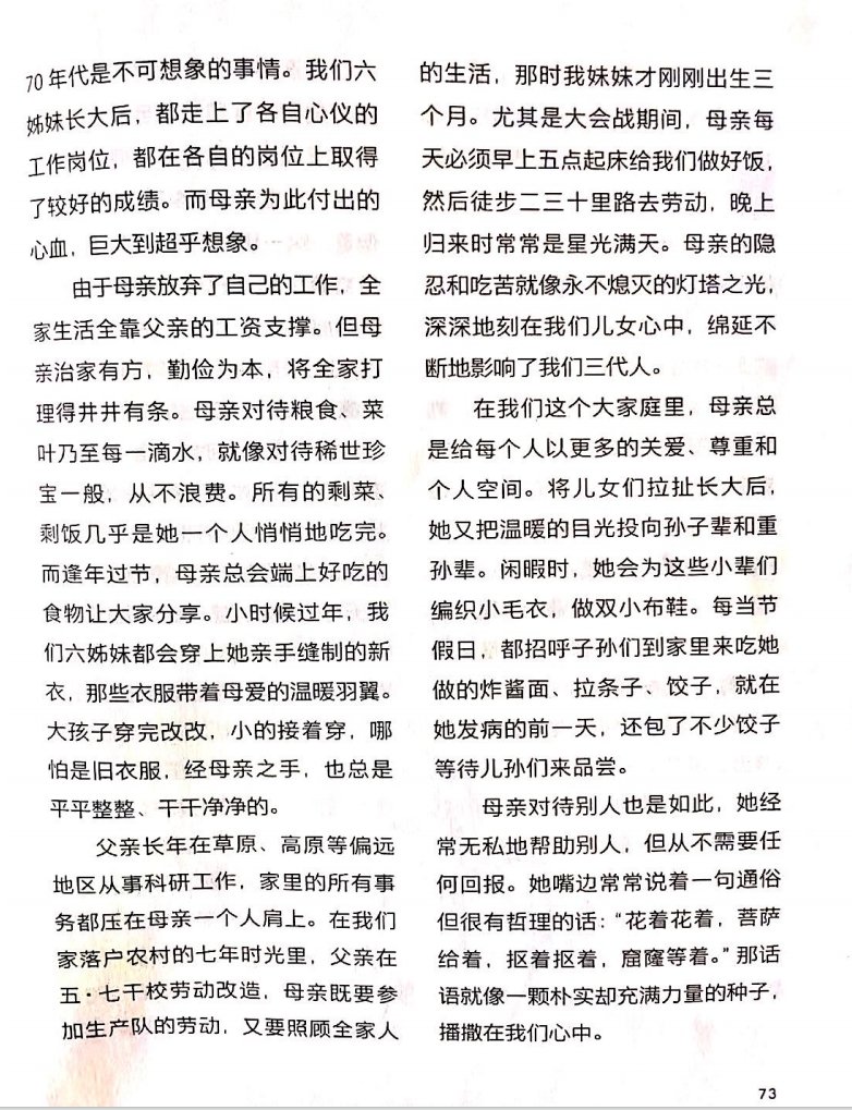 由于母親放棄了自己的工作,全家生活全靠父親的工資支撐。但母親治家有方,勤儉為本,將全家打理得井井有條。母親對待糧食、菜葉乃至每一滴水,就像對待稀世珍寶一般,從不浪費。所有的剩菜、剩飯幾乎是她一個人悄悄地吃完。而逢年過節,母親總會端上好吃的食物讓大家分享。小時候過年,我們六姊妹都會穿上她親手縫制的新衣,那些衣服帶著母愛的溫暖羽翼。大孩子穿完改改,小的接著穿,哪怕是舊衣服,經母親之手,也總是平平整整、干干凈凈的。