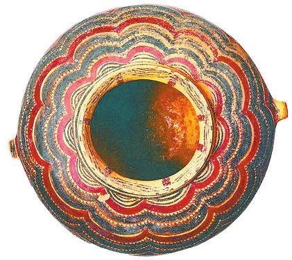 其中以馬家窯文化彩陶為代表,蘊含著眾多神秘的社會文化信息,以線條作為造型手段、以黑色(墨色)作為主要基調,奠定了中國畫發展的歷史基礎與以線描為特征的基本形式。馬家窯文化彩陶也是中國音樂舞蹈的開端呈現。1973年,甘青地區大通縣出土的馬家窯文化彩陶舞蹈紋盆,內壁繪舞蹈人物3組,每組5人,令人感受到遠古舞蹈強烈的節奏感。1991年,甘肅武威市發現的彩陶舞蹈紋盆,內壁繪有兩組手拉手的舞蹈人物,每組9人,舞蹈人數更多。1995年,宗日遺址再次出土一件馬家窯文化彩繪舞蹈紋盆,內壁所繪舞蹈人物兩組,分別為11人和13人,給人一種優雅的舞蹈意境。1986年,甘肅省永登縣出土馬家窯文化的彩陶鼓。這些珍貴的彩陶器物成為研究中國原始歌舞和音樂起源的佐證。