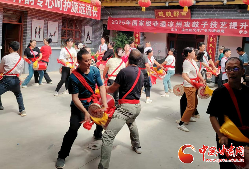 中國甘肅網7月19日訊(西北角·中國甘肅網記者 張振國 文/圖)為扎實推進國家級非物質文化遺產項目傳承與保護,系統提升涼州攻鼓子團隊專業水平,發展壯大攻鼓子傳承人隊伍。7月16日,由涼州區文體廣電和旅游局主辦、涼州區文化館承辦的2025年涼州攻鼓子傳承人技藝提升培訓班分別在“涼州攻鼓子傳習所”和“四壩鎮非遺民俗文化館”開班。
