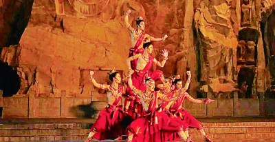 從中華優秀傳統文化中尋找藝術基因和創作靈感的文藝佳作不斷涌現,一部部舞臺表演藝術作品“破圈”而來,精彩紛呈。河南衛視2021年七夕節制作的《七夕奇妙游》中以龍門石窟石刻圖像飛天和金剛為素材編創的實景舞蹈《龍門金剛》,就是其中的杰作之一。懷抱樂器的伎樂天從洞窟中飛出,在大佛的注視下翩翩起舞,金剛力士形象逼真、栩栩如生。藝術家賦予傳統文化遺存跨越歷史的藝術魅力。古風豫韻舞蹈藝術與龍門石窟悠久的歷史文化相得益彰,將“文化+旅游”的精髓和深意作了深刻的演繹和闡釋。