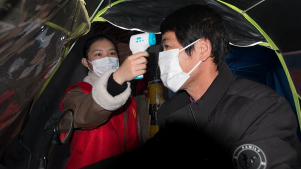 自疫情防控工作開展以來,湖北省咸寧市咸安區紀委監委90后干部黃煬,始終堅守防疫一線,參與卡點值守、入戶摸排、生活物資代購等工作,耐心安撫居民情緒,為他們進行心理疏導。圖為黃煬為夜歸的居民測量體溫。(湖北省咸寧市咸安區紀委監委 魯一凡 攝)