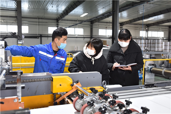 為切實幫助復工復產企業解決實際困難,安徽省滁州市南譙區紀委監委女干部們組成“巾幗服務隊”,深入企業生產加工車間,開展調研走訪,跟進督促政策落實。(安徽省滁州市南譙區紀委監委 孫煒 攝)