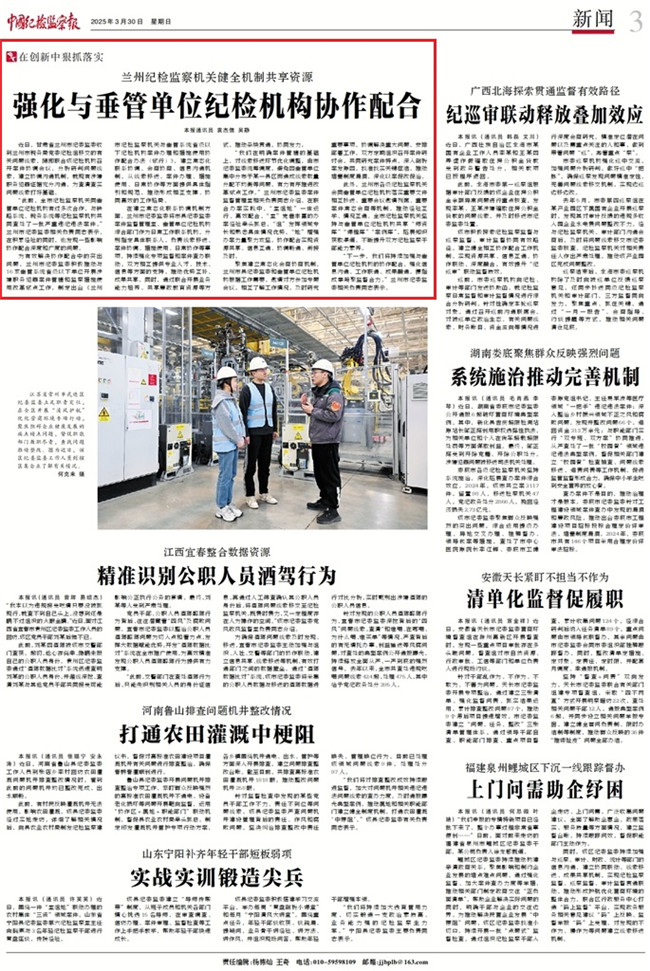 此外,蘭州市各級紀檢監察機關會同垂管單位紀檢機構落實重要文件相互抄送、重要會議邀請列席、重要案件常態會商等機制,推動經驗互學、情況互通。全市紀檢監察機關堅持與垂管單位紀檢機構共享“師資庫”“課程庫”“案例庫”,拓展知識獲取渠道,不斷提升雙方紀檢監察干部能力素養。