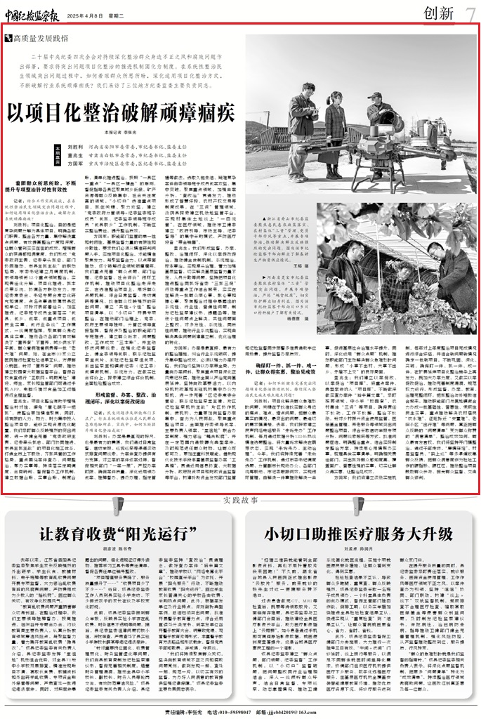 二十屆中央紀委四次全會對持續(xù)深化整治群眾身邊不正之風和腐敗問題作出部署,要求將突出問題項目化整治的推進機制固化為制度。在系統(tǒng)性整治民生領(lǐng)域突出問題過程中,如何著眼群眾所思所盼,深化運用項目化整治方式,不斷破解行業(yè)系統(tǒng)頑瘴痼疾?我們采訪了三位地方紀委監(jiān)委主要負責同志。
