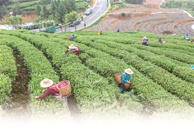 重慶市綦江區立足綠色生態資源稟賦,將茶產業打造成助力鄉村振興的主導產業,讓“綠葉子”成為“金葉子”。圖為該區石角鎮新農村村民在茶園內采摘鮮茶葉。新華社發