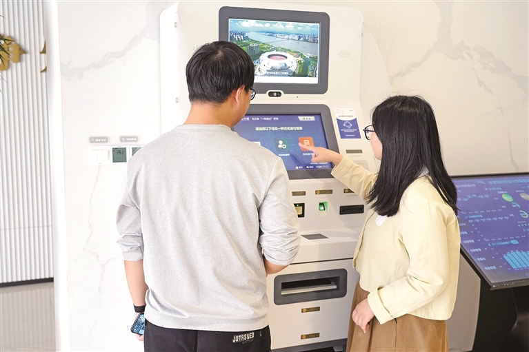 5月10日,浙江省平湖市林埭鎮徐家埭村的數智生活館內,村民在工作人員的幫助下,使用政務服務長三角“一網通辦”終端辦理業務。金苗 攝