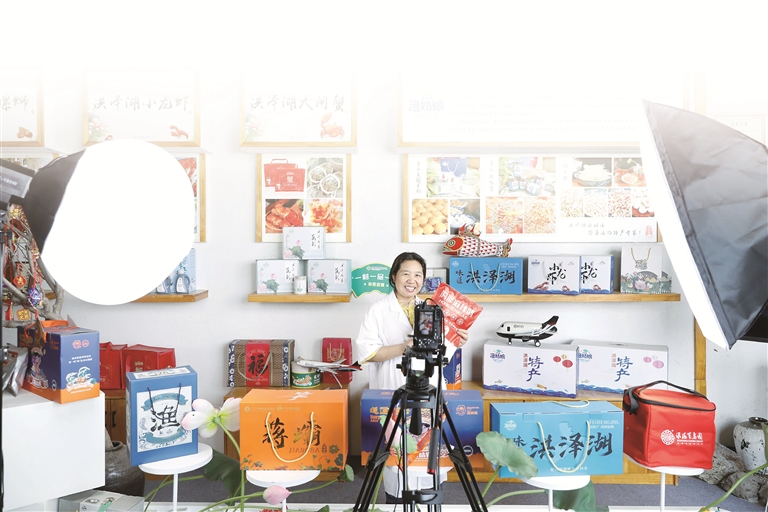 5月21日,江蘇省淮安市洪澤區“漁姑娘”助農直播間內,主播正在向網友介紹當地特色農產品。陳凱 攝