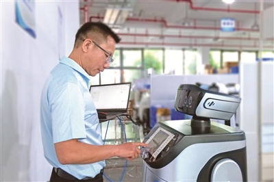 福建省福州市,服務機器人應用技術員謝茂皇正在對機器人產品的功能進行調試。周磊 攝