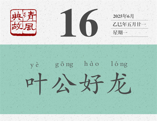 西漢劉向《新序·雜事》有一則寓言:“葉公子高好龍,鉤以寫龍,鑿(通‘爵’,酒具)以寫龍,屋室雕文以寫龍。于是夫龍聞而下之,窺頭于牖,施(yì,延伸)尾于堂。 葉公見之,棄而還走,失其魂魄,五色無主。是葉公非好龍也,好夫似龍而非龍者也。”