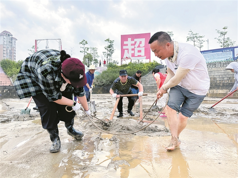廣西壯族自治區(qū)柳州市融安縣紀委監(jiān)委聞“汛”而動,緊盯防汛統(tǒng)籌協(xié)調(diào)等關(guān)鍵環(huán)節(jié)開展全程監(jiān)督檢查。圖為日前,該縣紀檢監(jiān)察干部在河東龍舟廣場開展災后清淤工作。覃燕 攝