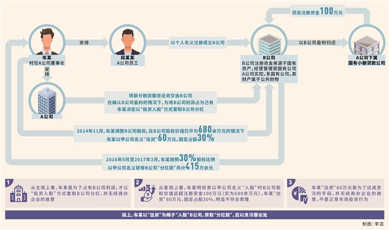 第二,車某的所謂出資行為并非市場投資行為,而是其利用職務便利獲取本屬于國有公司B公司的確定性預期收益的犯罪手段。本案中,車某明知其以甲公司名義“入股”時,B公司實際資產高于注冊資金100萬元。經查,在車某以甲公司名義“入股”B公司時,B公司實際股權價值為680余萬元,車某“出資”60萬元占股30%,明顯不符合常理,換言之,車某“出資”60萬元不應獲得30%股權。車某的真實目的是在不承擔市場風險的前提下,利用擔任A公司董事長的職務便利,將A公司確定能夠盈利的融資業務交給B公司經營,并在確認B公司能夠盈利的情況下,以“出資”為幌子“入股”B公司,獲取“分紅款”,應以貪污罪論處。
