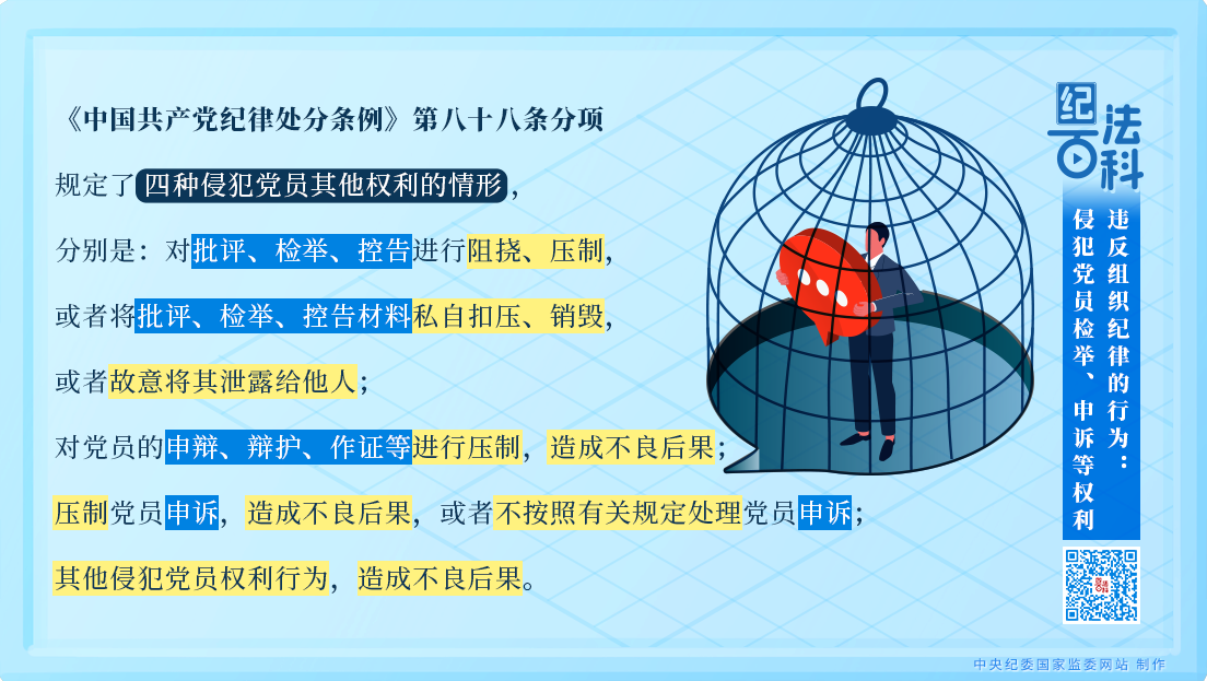 《中國共產(chǎn)黨紀(jì)律處分條例》第八十八條分項(xiàng)規(guī)定了四種侵犯黨員其他權(quán)利的情形,分別是:對批評、檢舉、控告進(jìn)行阻撓、壓制,或者將批評、檢舉、控告材料私自扣壓、銷毀,或者故意將其泄露給他人;對黨員的申辯、辯護(hù)、作證等進(jìn)行壓制,造成不良后果;壓制黨員申訴,造成不良后果,或者不按照有關(guān)規(guī)定處理黨員申訴;其他侵犯黨員權(quán)利行為,造成不良后果。