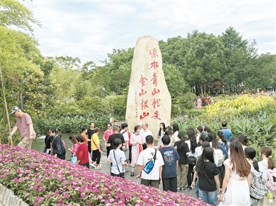 20年來,在綠水青山就是金山銀山理念的指引下,浙江省安吉縣余村努力修復生態,發展生態旅游,探索出一條環境保護與經濟發展相協調的新路。游客正在“綠水青山就是金山銀山”石碑前拍照留念。