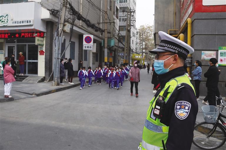 中國甘肅網4月12日訊 據蘭州日報報道(記者 葛 強 文/圖)隨著全市中小學返校復課,為給廣大師生營造良好的道路交通環境,4月11日,蘭州市公安局各交警大隊結合轄區復課首日道路交通實際情況,全面啟動護學崗,安排警力在學生上、下學期間加大校園及周邊道路交通疏導力度,切實筑牢校園周邊交通安全防線。