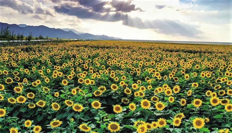 時下,位于白銀市景泰縣寺灘鄉境內的永泰川戈壁灘,萬畝滴灌的旱砂田里葵花盛開,斜陽之下猶如一幅金色畫卷。