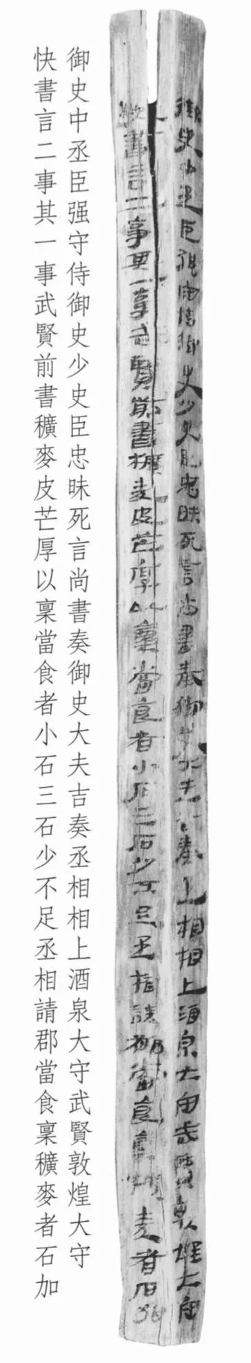 此簡為漢宣帝回復酒泉太守“辛武賢”和敦煌太守“快”奏疏的恩準詔書,簡文記載的是皇帝詔書中對兩太守奏疏內容的復述。從簡文內容看,酒泉太守辛武賢和敦煌太守快給朝廷的奏疏主要涉及兩件事情:一是辛武賢認為作為糧草的穬麥因皮厚芒長,如按規定每人發放小石三石,會造成實際數量的不足,所以他請求皇帝每石加發若干。另一件事顯然是敦煌太守快的上書,但文字未能容納于此簡,故不得而知。