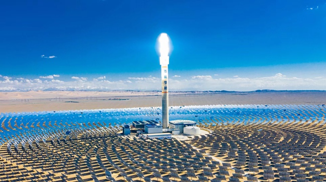 位于甘肅省敦煌市光電產業園區的首航高科敦煌100兆瓦熔鹽塔式光熱電站內,1萬余面定日鏡以同心圓狀圍繞著260米高的熔鹽塔逐日發電。敦煌市委宣傳部供圖