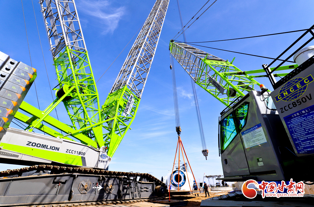 2月21日,張掖市臨澤縣平川北灘30萬千瓦風電項目建設現場,工作人員正在進行主機吊裝。